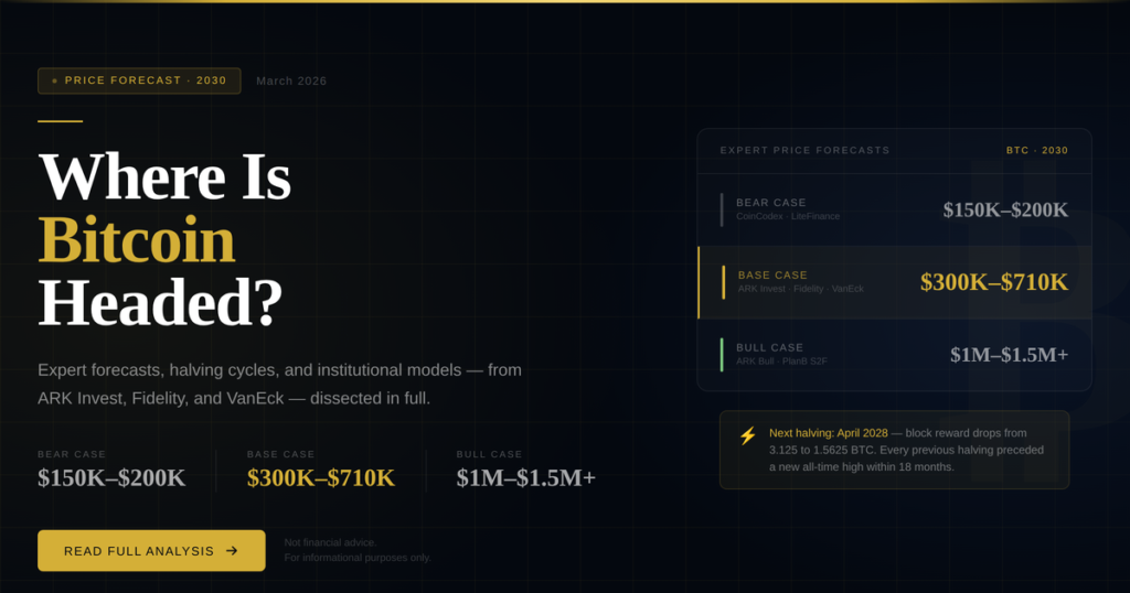 The most credible institutional forecasters — ARK, Fidelity, VanEck — converge on a range of $300,000 to $1.5 million by 2030. The conservative algorithmic models suggest a floor around $150,000–$200,000. The ultra-bullish S2F models envision a multi-million-dollar asset.